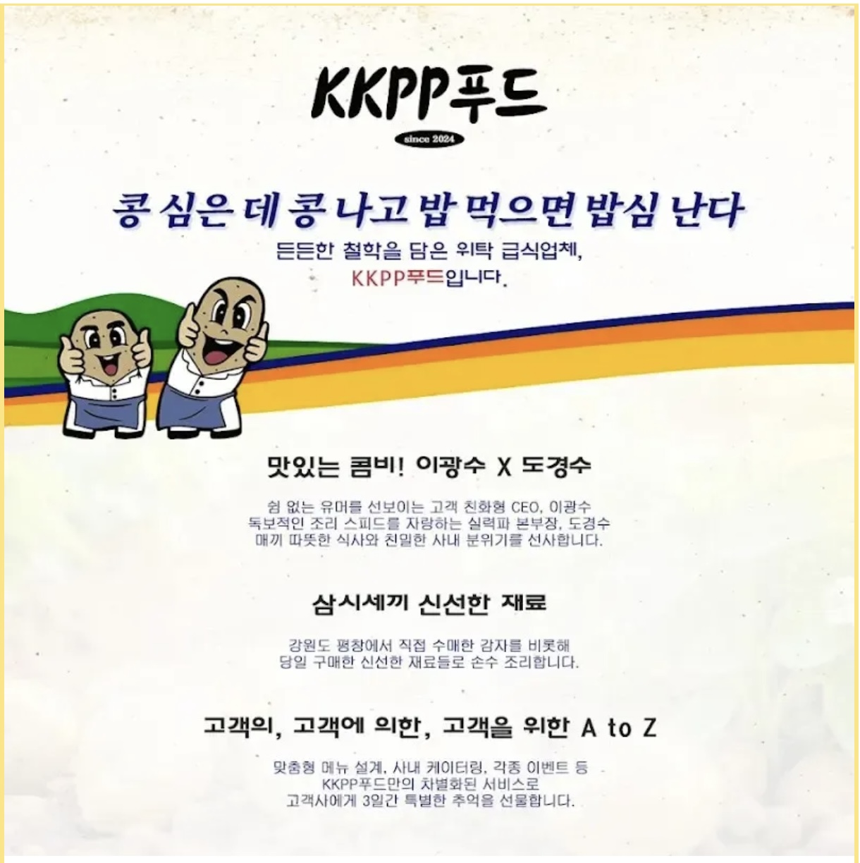 삼시세끼 영상이 공개 되고 얼마 뒤 제작사인 에그이즈 커밍에서는 꽤나 본격적이고, 진지하게 위탁 급식업체인 kkpp(콩콩팥팥) 푸드의 소개와 임직원 인사말을 공개했고, 소개란 안에 있는 감자 캐릭터를 본 사람들은 "그냥 딱 봐도 캐릭터가 도경수와 이광수다", "이렇게까지 진지하게 할 줄은 몰랐다", "벌써부터 웃기고 기대된다" 라는 등의 반응을 보였다.