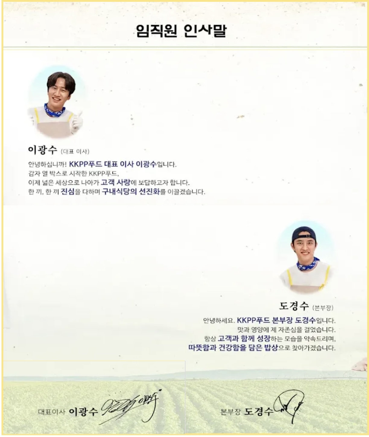 이번 콩콩밥밥은 kkpp 푸드의 임직원과 본부장, 외부감사로 이루어져 있으며 대표이사로는 이광수 배우가, 본부장으로는 가수이자 배우인 도경수 님이, 그리고 외부 감사로는 지난 콩콩팥팥 시즌을 함께한 배우 김우빈 님이 자리를 맡았다고 한다. 임직원 인사말을 통해 대표이사가 이광수 님 이라고 적혀는 있지만, 영상을 통해 확인해보면 실질적인 대표는 도경수 님이 될 것으로 보인다.