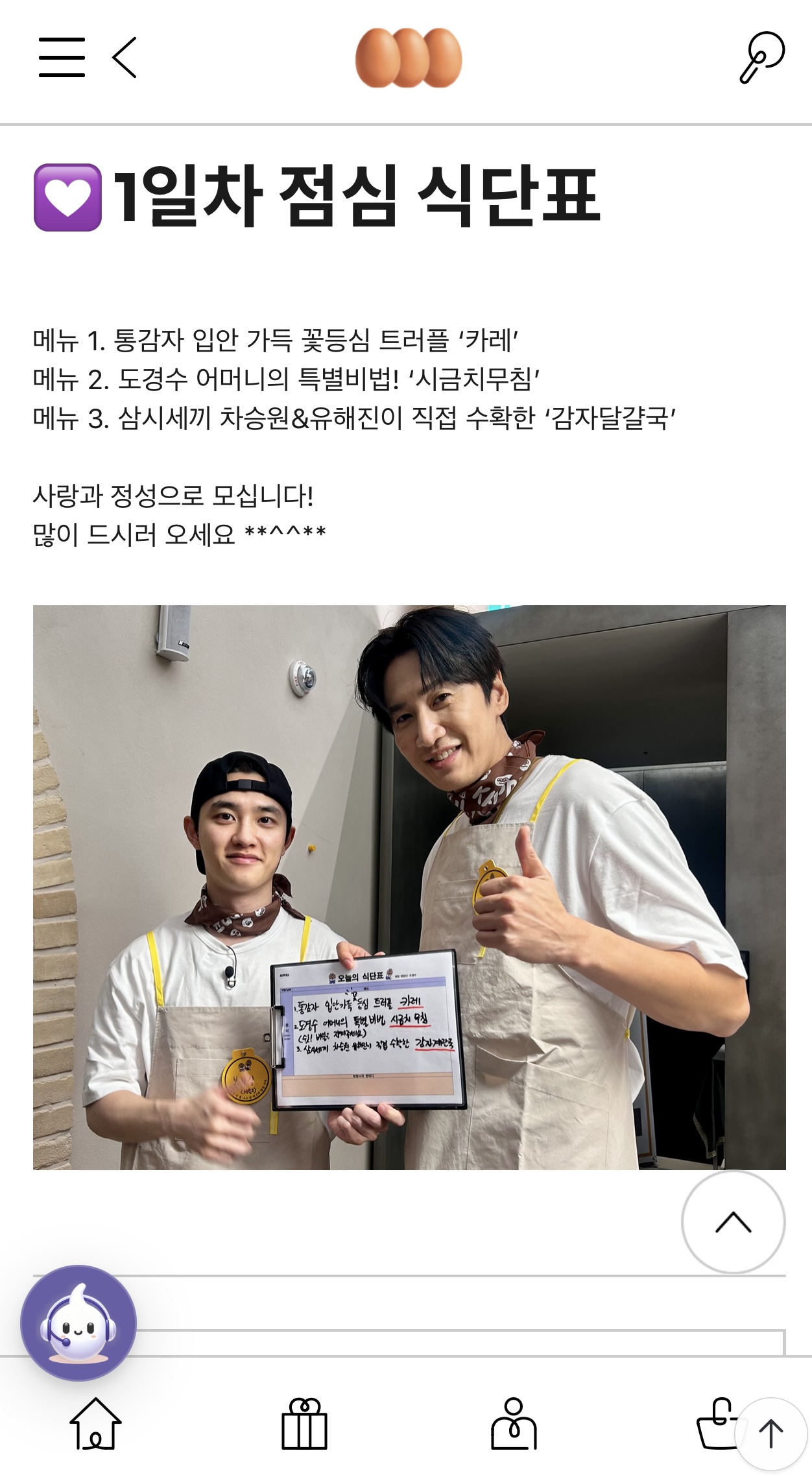 이어 에그이즈커밍 게시판의 점심 식단표에서 1일차 점심 식단표를 공개하며 첫 방송에서는 삼시세끼에서 보여줬던 감자를 이용한 요리를 해 구내식당 음식을 만들어 갈 것으로 보인다. 자세한 점심 식단표는 아래 링크를 통해 확인 할 수 있다.